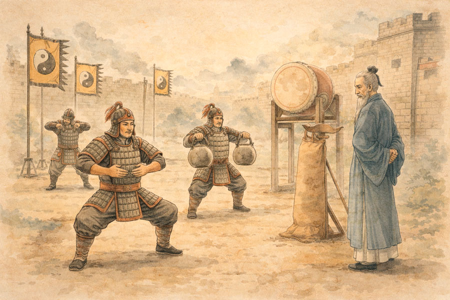 В доимперский период (в т.ч. Сражающиеся царства) существовали практики дыхания, саморегуляции и даоинь, которые в последующей традиции связывали с укреплением тела и подготовкой воина.
