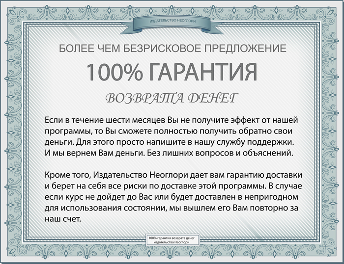 И, конечно, мы избавим вас от любых неудобств и переживаний (в том случае, если программа вам не подойдет), с помощью нашей знаменитой более чем 100 процентной гарантии.